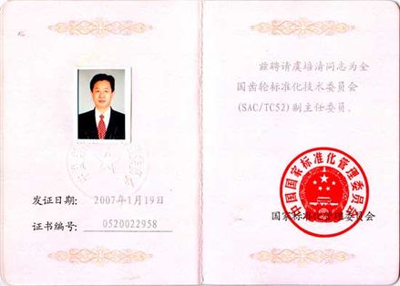2007年1月,國(guó)家標(biāo)準(zhǔn)化管理委員會(huì)正式頒發(fā)聘書,聘任虞培清總經(jīng)理為全國(guó)齒輪標(biāo)準(zhǔn)化技術(shù)委員會(huì)副主任委員。這一殊榮體現(xiàn)了虞總在齒輪行業(yè)標(biāo)準(zhǔn)化工作中作出的孜孜努力。